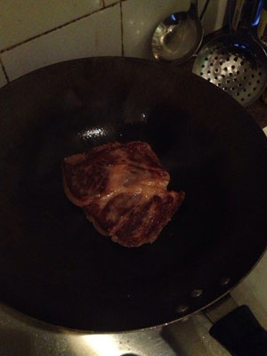 7.鍋內(nèi)放一點(diǎn)油,猛火燒熱鍋,待溫度上來(lái)后放入牛排,這時(shí)鍋內(nèi)會(huì)有油爆聲,不要怕,一直讓牛排煎,千萬(wàn)不要翻動(dòng),