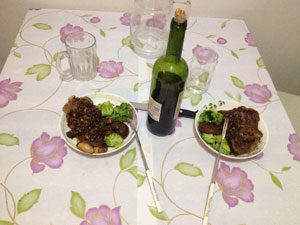 最后牛排出鍋澆上做好的蘑菇汁,倒上兩杯紅酒,就可以和自己心愛(ài)的人來(lái)享受這簡(jiǎn)單而又美味的晚餐了。